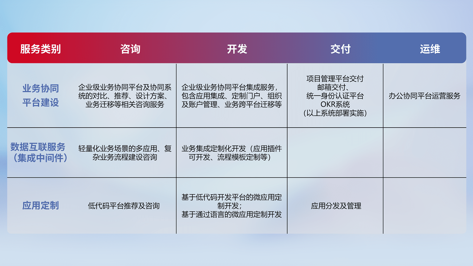 针对钉钉、、、企微、、、IDaas等平台级产品提供产品的规划、、、方案、、、交付、、、定制化开发等服务,,,实现如统一协同办公、、、智能客户服务、、、、混合会议管理、、智能数据查询、、、等业务场景,,实现数字化转型。。